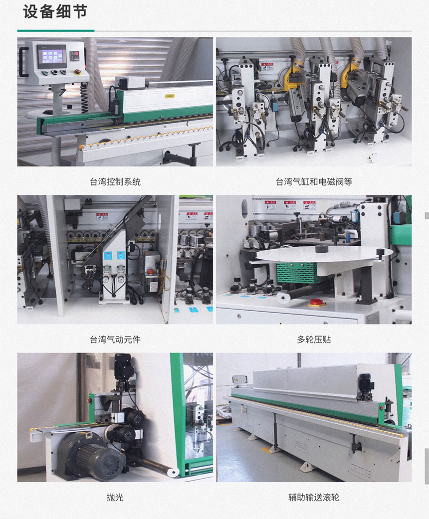 主要功能:涂膠貼邊,封邊切斷,前后齊頭,粗修,精修,刮邊,拋光。自動(dòng)化對(duì)板材進(jìn)行封邊處理。