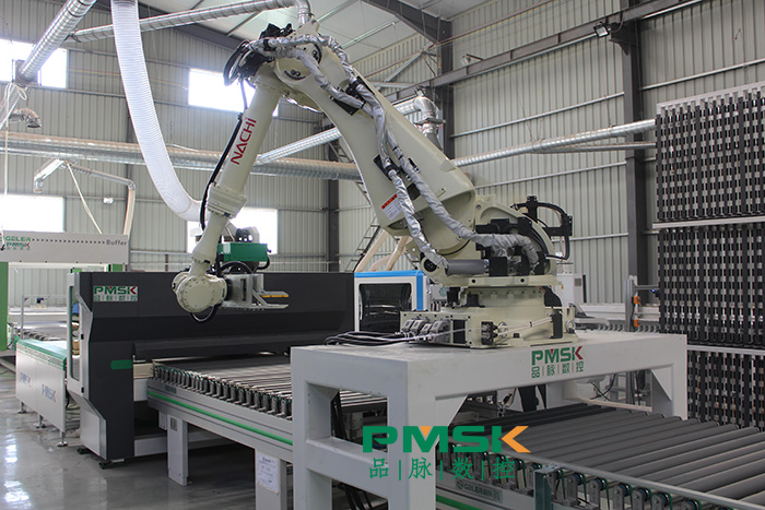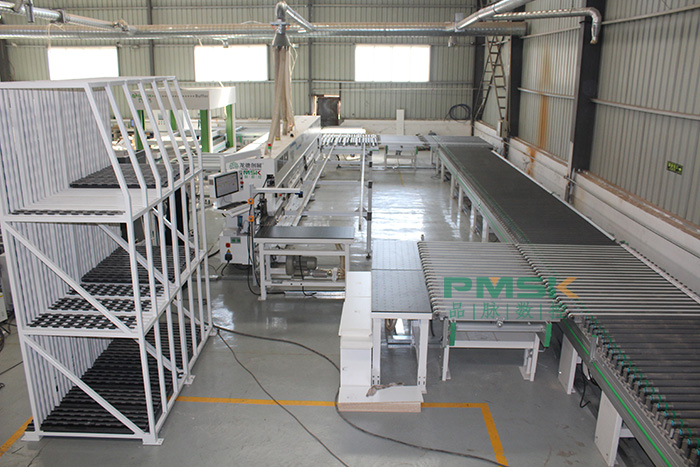 數(shù)控開料機連線,逐步增加中間相連接的設備,如開料設備、多軸搬運機器人、封邊回轉(zhuǎn)線系統(tǒng)、動力傳輸線、龍門抓料機、