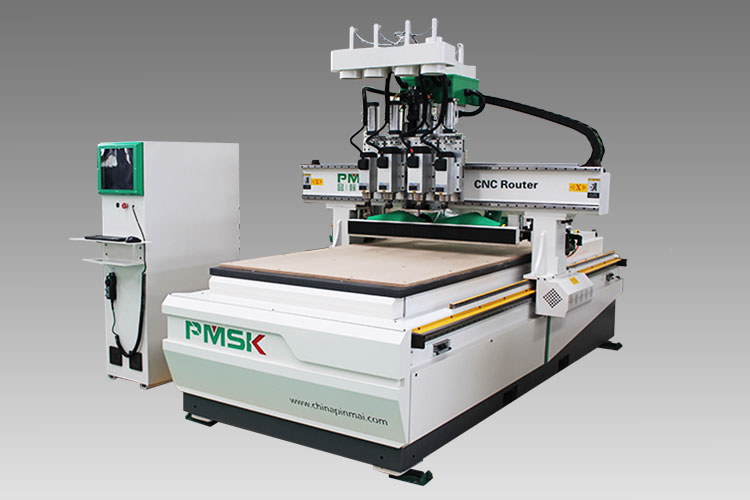 ,當需要換刀時,當前的機頭上去,需要的機頭下來繼續雕刻。木工加工中心是僅有一個機頭,但是他擁有一個刀庫,不同機型有不同的刀庫容量,有8把、12把等,根據刀庫的形狀和換刀方式有盤式換刀、斗笠式換刀、排式換刀等,換刀時,機頭移動至刀庫,選擇好需要的刀具,回來繼續雕刻。
