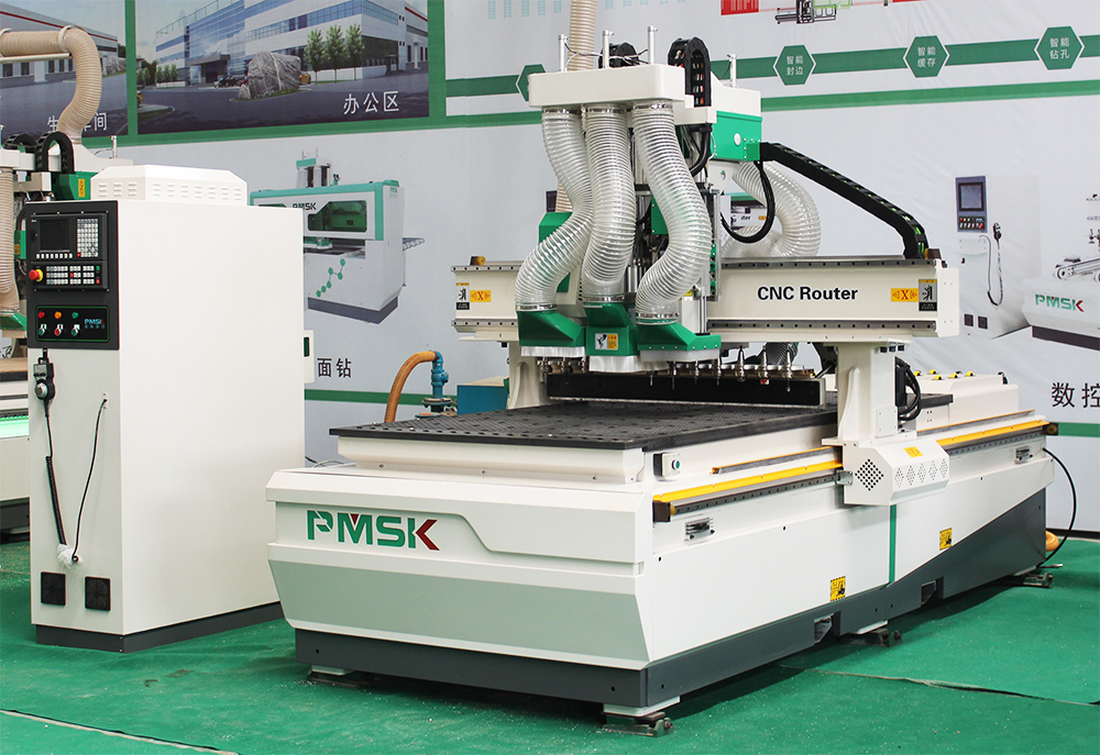 數控拉米諾開料機板式家具開料設備中的一種,主要是數控化解決板式家具制作中對板材進行鉆孔、銑槽、切割、雕刻、銑形等工序。拉米諾開料機機器機頭結構部分必須加裝四軸旋轉鋸,用鋸片進行銑拉米諾隱形件所需月牙槽。就目前市面上比較先進的數控拉米諾開料機來說,機器頭部結構搭配了9KW自動換刀主軸、排鉆組、四軸旋轉鋸三大機械部件。機器自動換刀主軸配合12把容量刀庫,可以解決各種復雜生產工序,包括銑形,雕刻,鏤空等,排鉆組能夠提高機器做定制家具打孔效率,四軸旋轉鋸用鋸片銑拉米諾月牙槽,效率高,精度高。并且數控拉米諾開料機還能夠加工U型扣、木得易等隱形連接件所需的安裝槽。