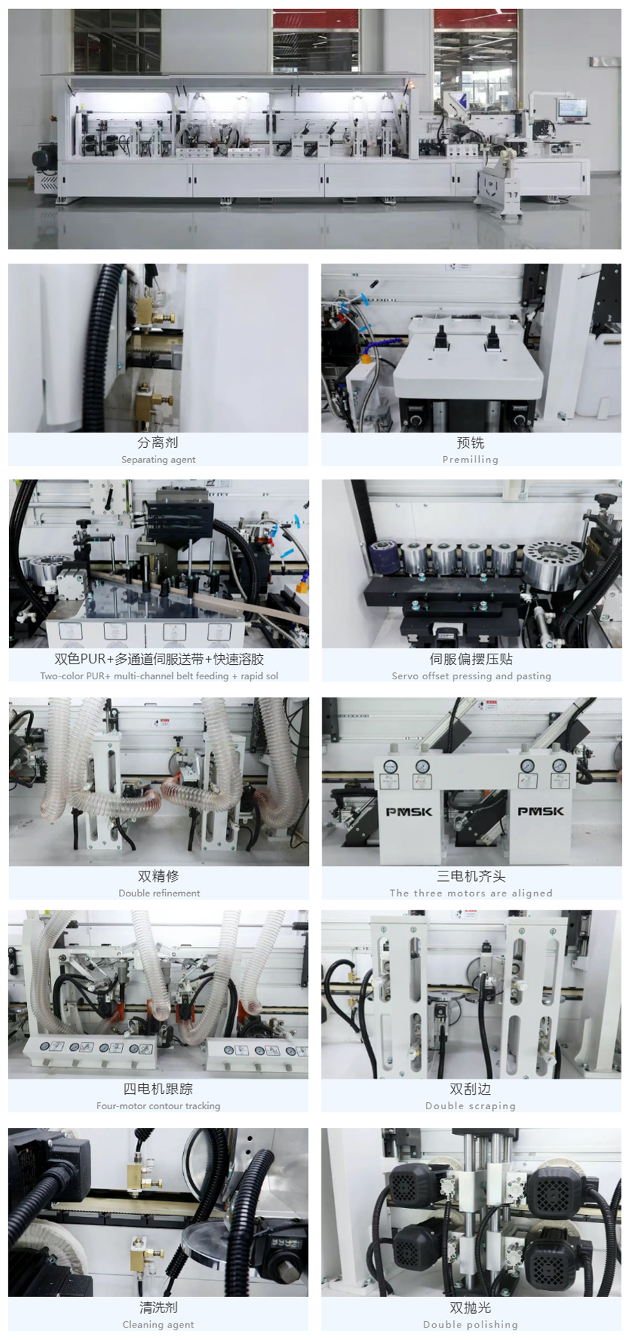 The servo-regulated pressure beam structure enables precise control, allowing for rapid adjustment of edge banding for plates of different thicknesses.
