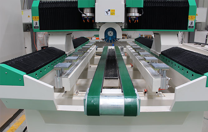 2、 傳送帶自動輸送至適合加工的位置(后側紅外線為基準),側推矯正板材自動定位,自動裝夾。無須對原點,只須確定盆孔的位置,開始加工。即:鋸片開孔(方孔),左右兩側主軸一個修角,一個精磨。
